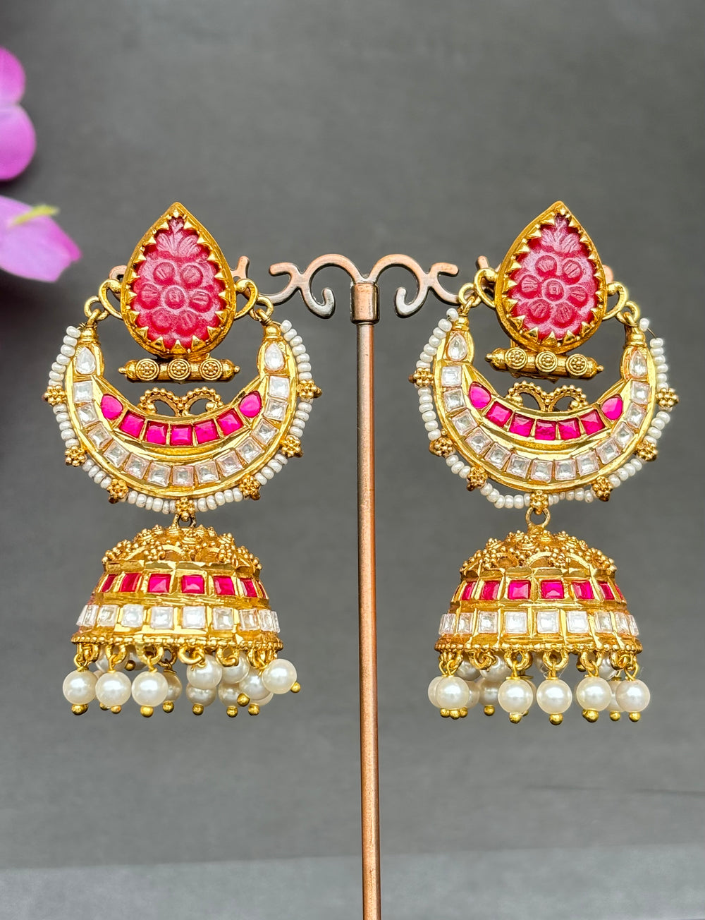 Step into a world of enchantment with our Pink Meenakari Heeramandi Jhumkis. Like whispers of twilight, these earrings captivate with their rich hue and intricate design. Adorned with shades of royal pink, they exude an aura of regal elegance and timeless beauty. Let them be the crowning glory of your ensemble, a testament to your impeccable taste and captivating presence.