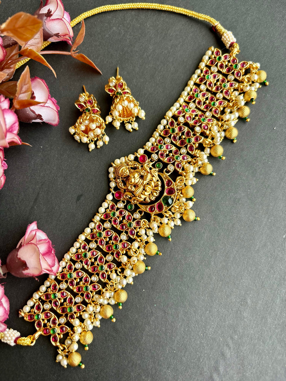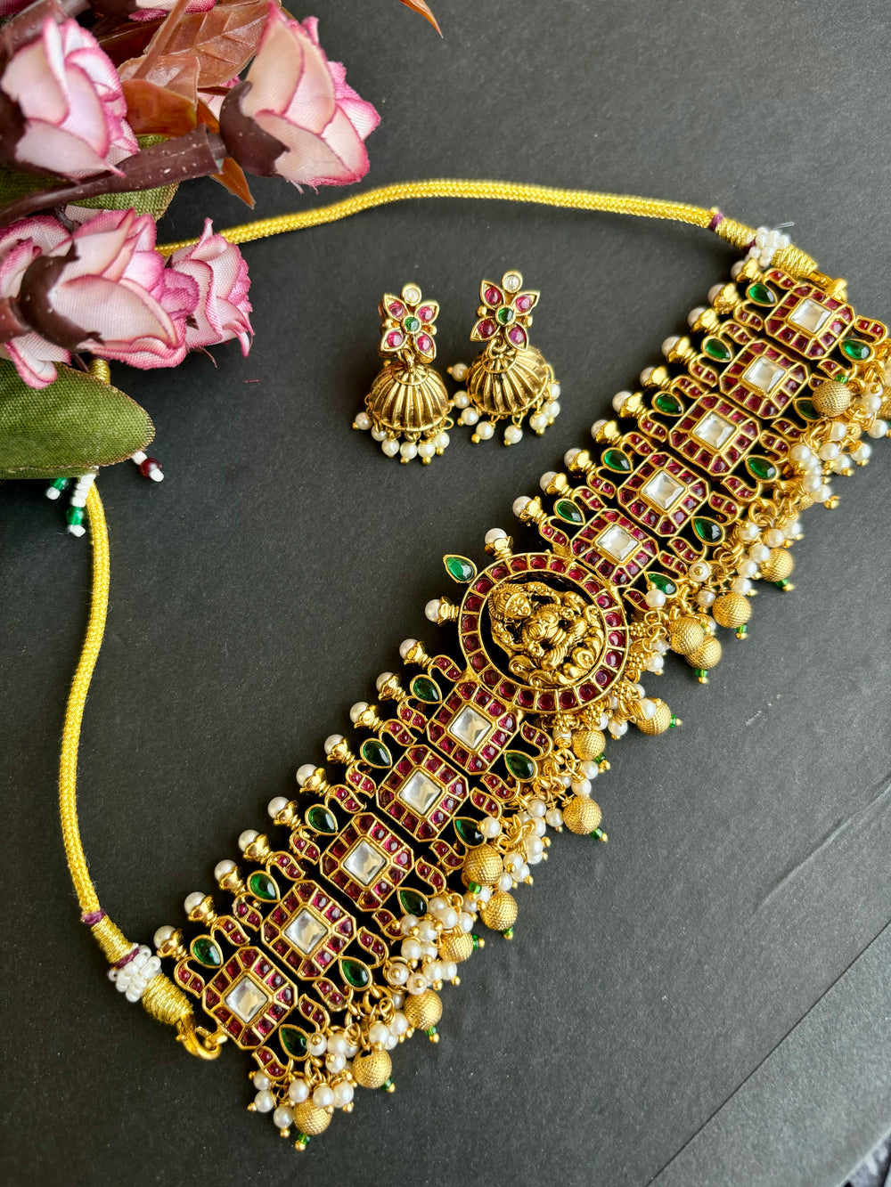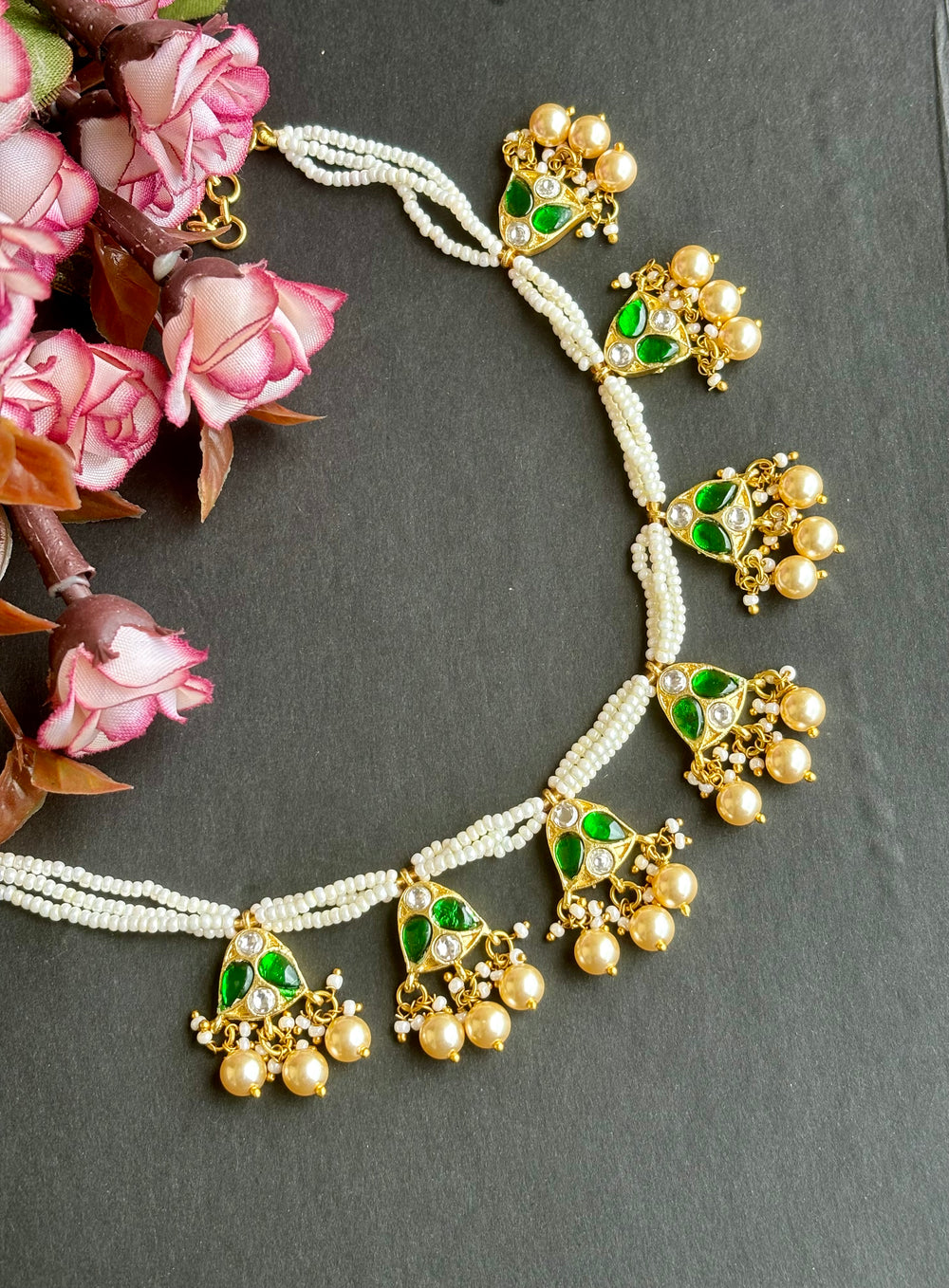Exuding understated luxury, this Choker set showcases a matte finish, adorned with semiprecious kemp and green stones arranged in an intricate pattern, accented by delicate pearls. A testament to timeless elegance. Paired with elegant earrings, it's the perfect accessory for weddings and festives.
