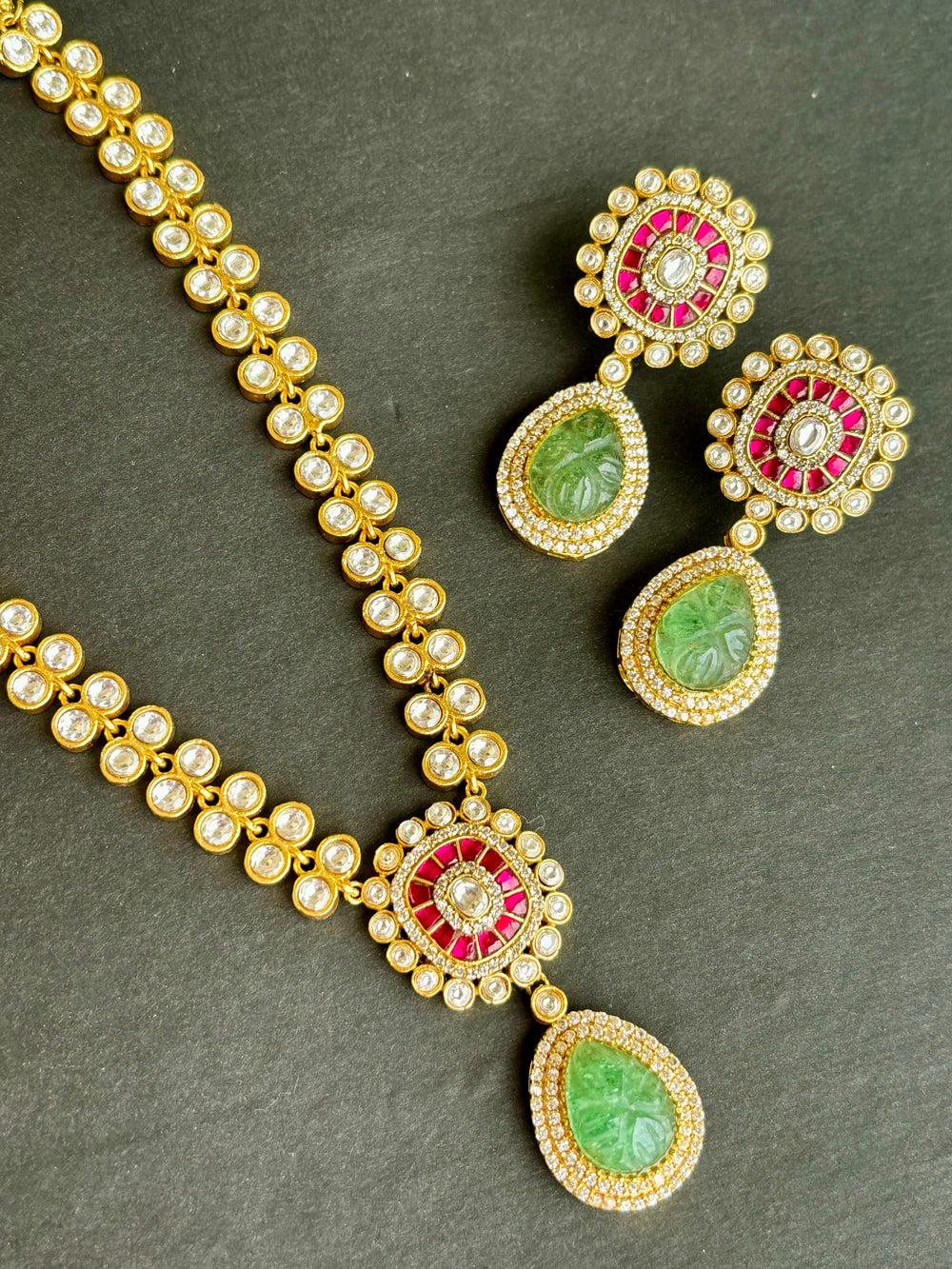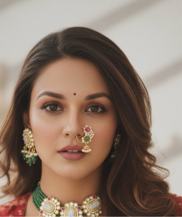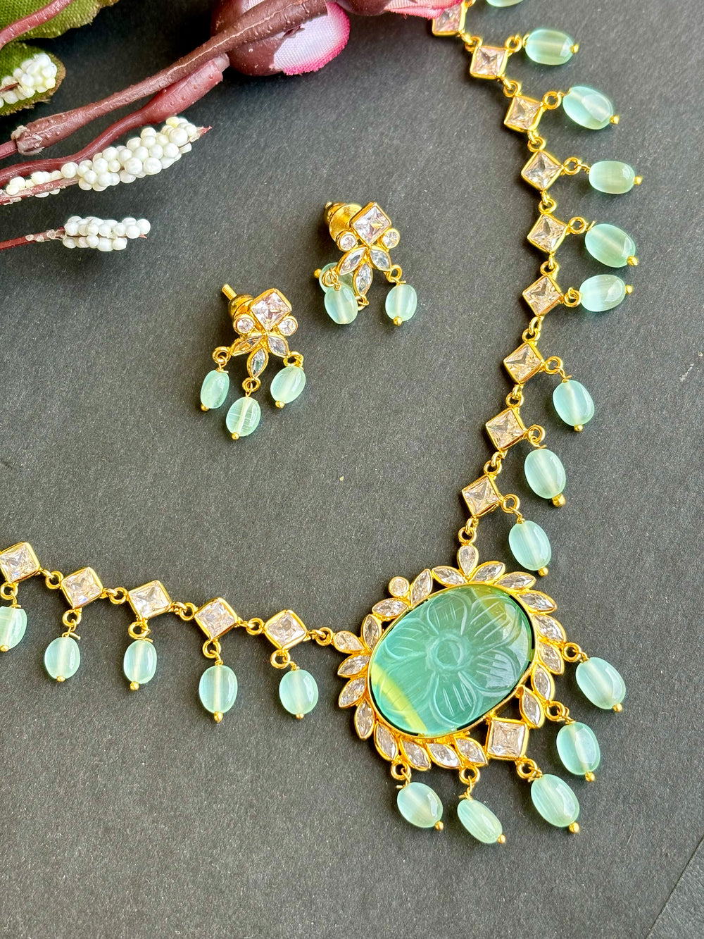 Exuding understated luxury, this Choker set showcases a matte finish, adorned with semiprecious kemp and green stones arranged in an intricate pattern, accented by delicate pearls. A testament to timeless elegance. Paired with elegant earrings, it's the perfect accessory for weddings and festives.