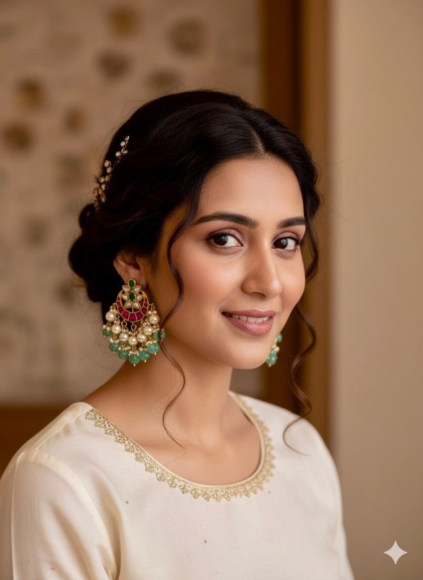 These exquisite Kemp earrings feature a striking combination of golden and dark pink stones, offering a touch of timeless elegance. The intricate design is enhanced with delicate swarovski pearls at the bottom along with mint melon beads, adding a graceful and classic finish. These lightweight earrings effortlessly blend tradition with contemporary style.